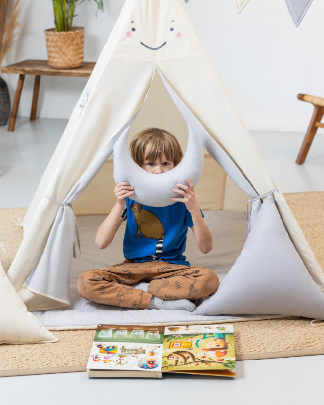 À l'intérieur : chaleur, calme et cette atmosphère particulière qu'ont les endroits créés pour quelqu'un de petit. À l'extérieur : une tente qui sourit à toute la pièce.