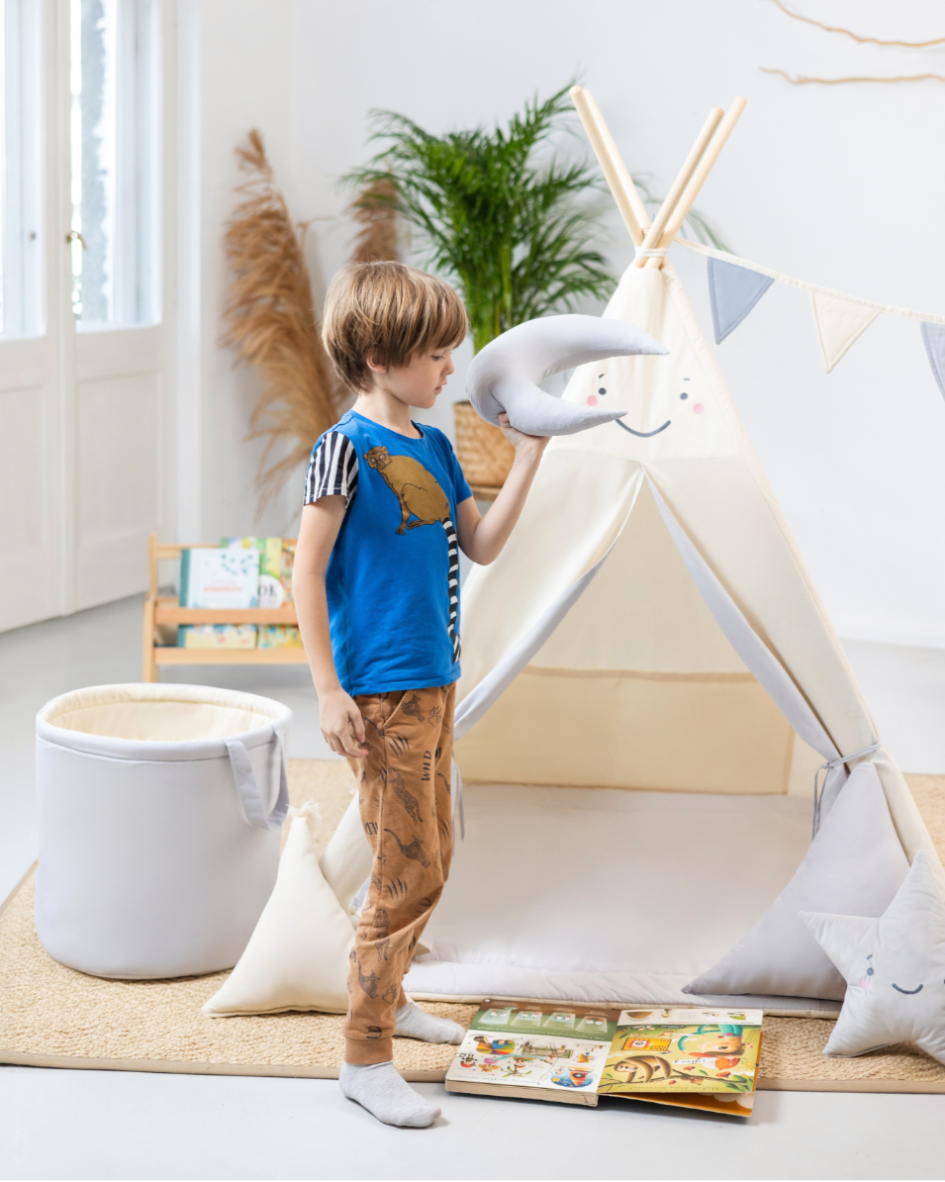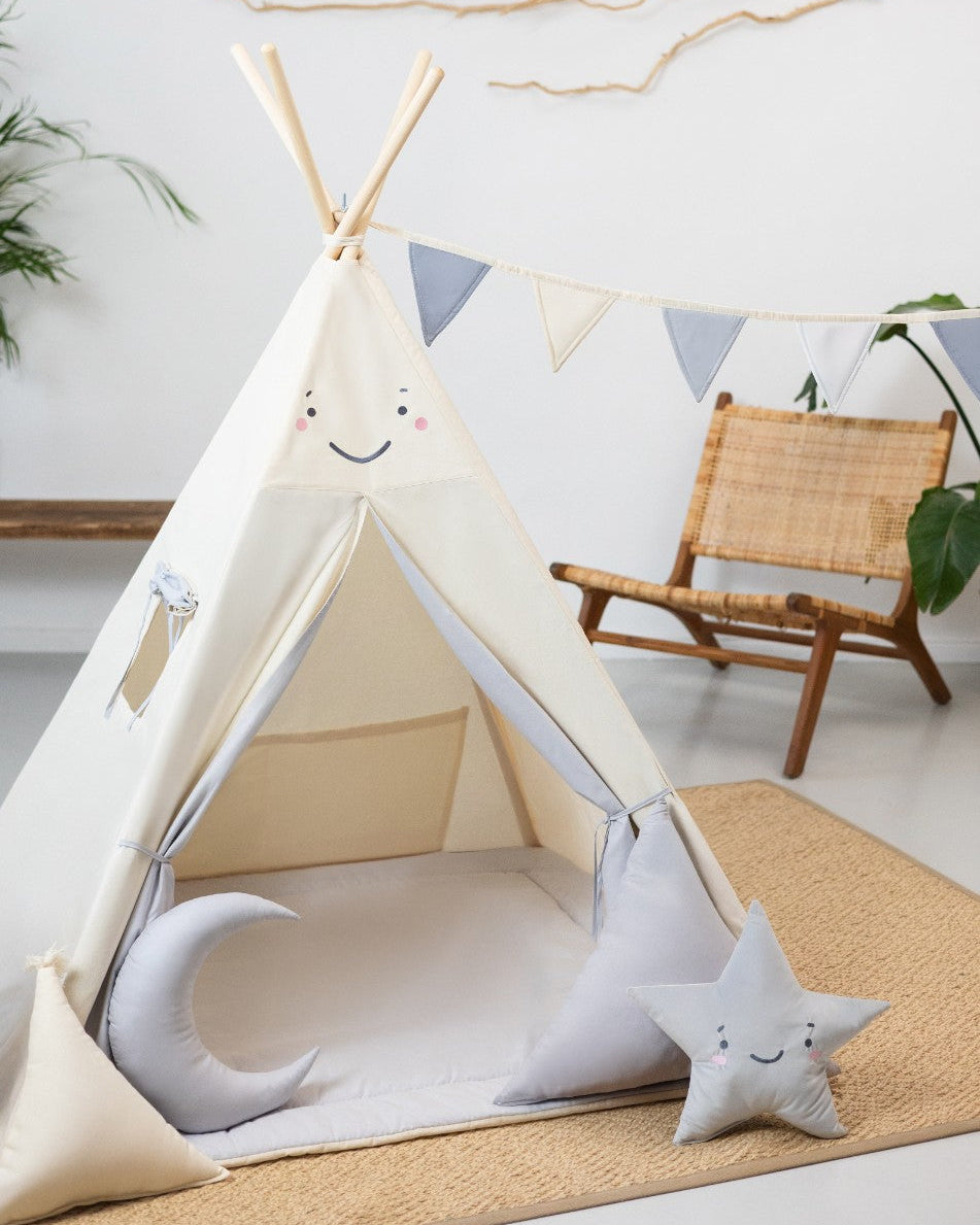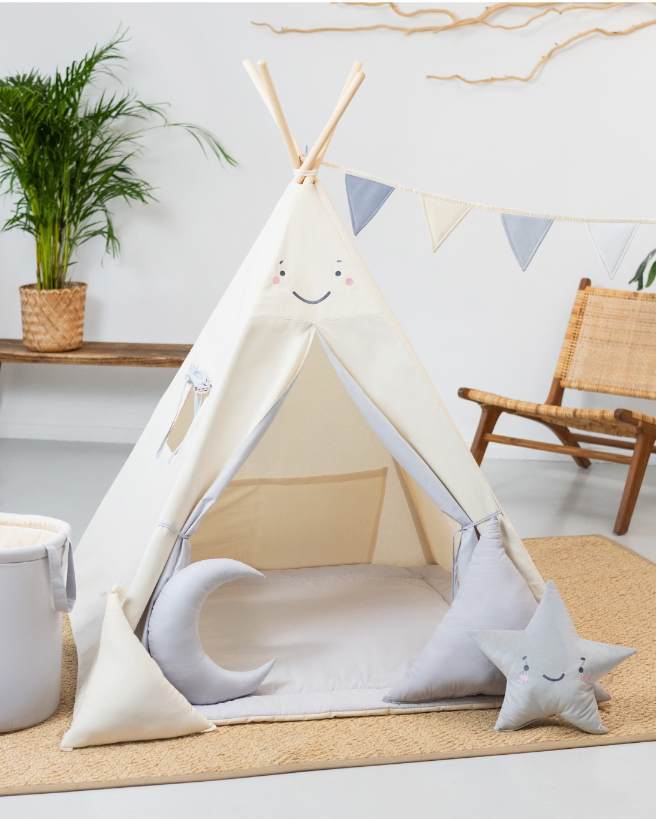 Une forteresse douillette de 110×110×156 cm. À l'extérieur – toile crème Whisper White avec de douces touches grises Barely Blue. À l'avant – un visage souriant qui accueille tous ceux qui entrent.