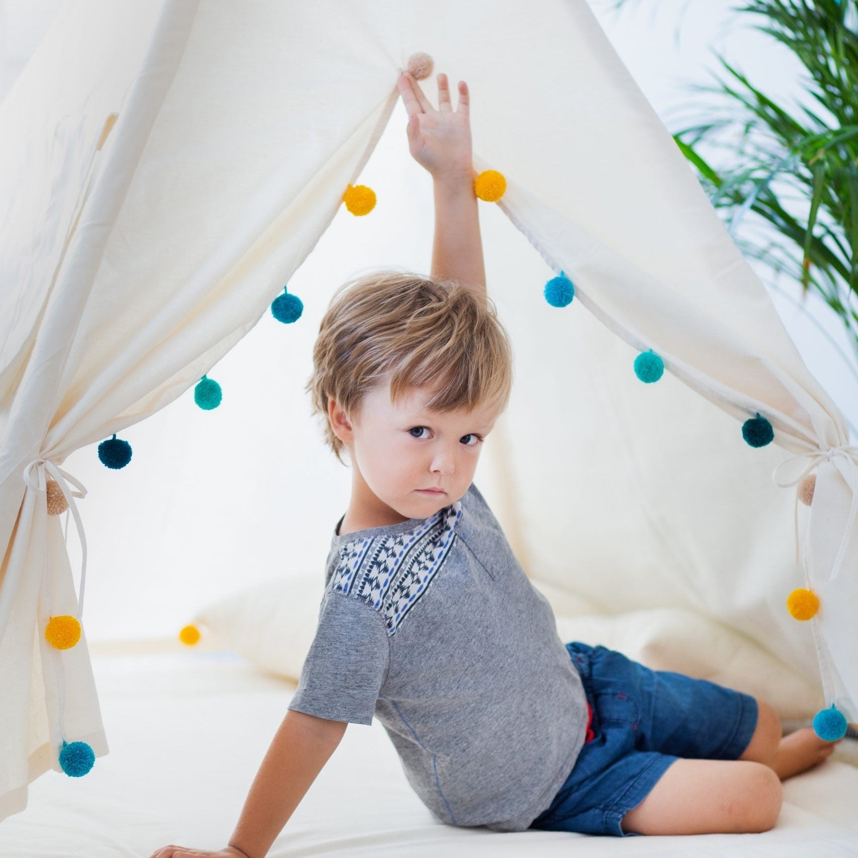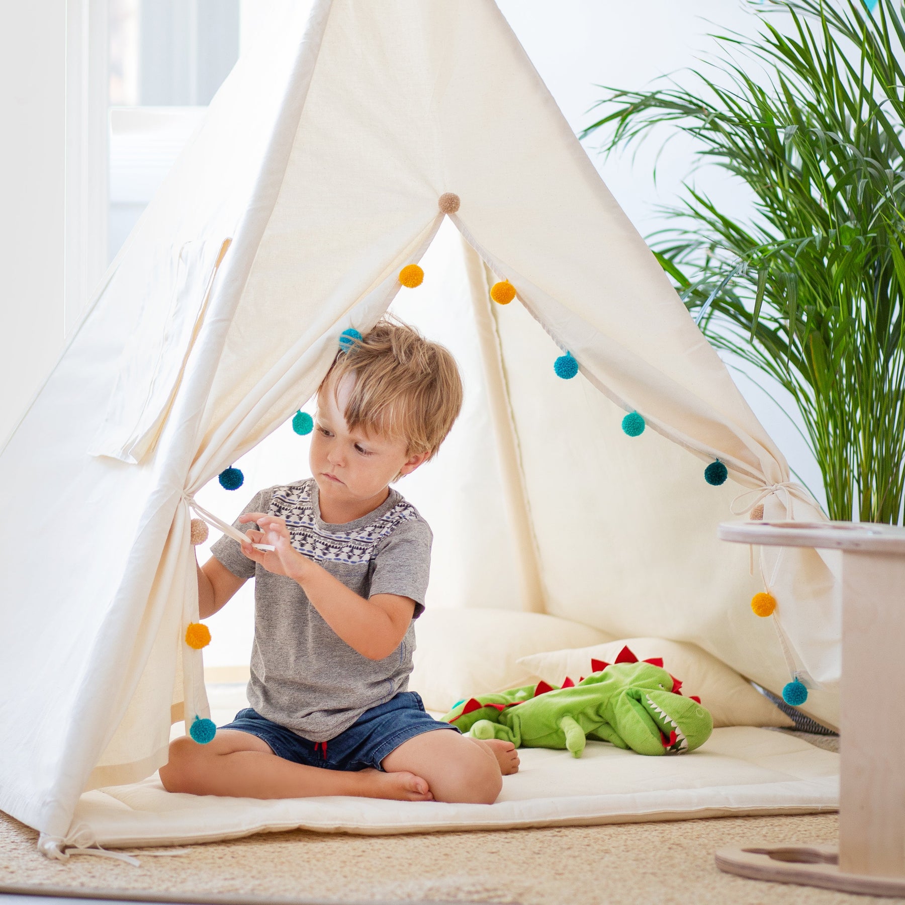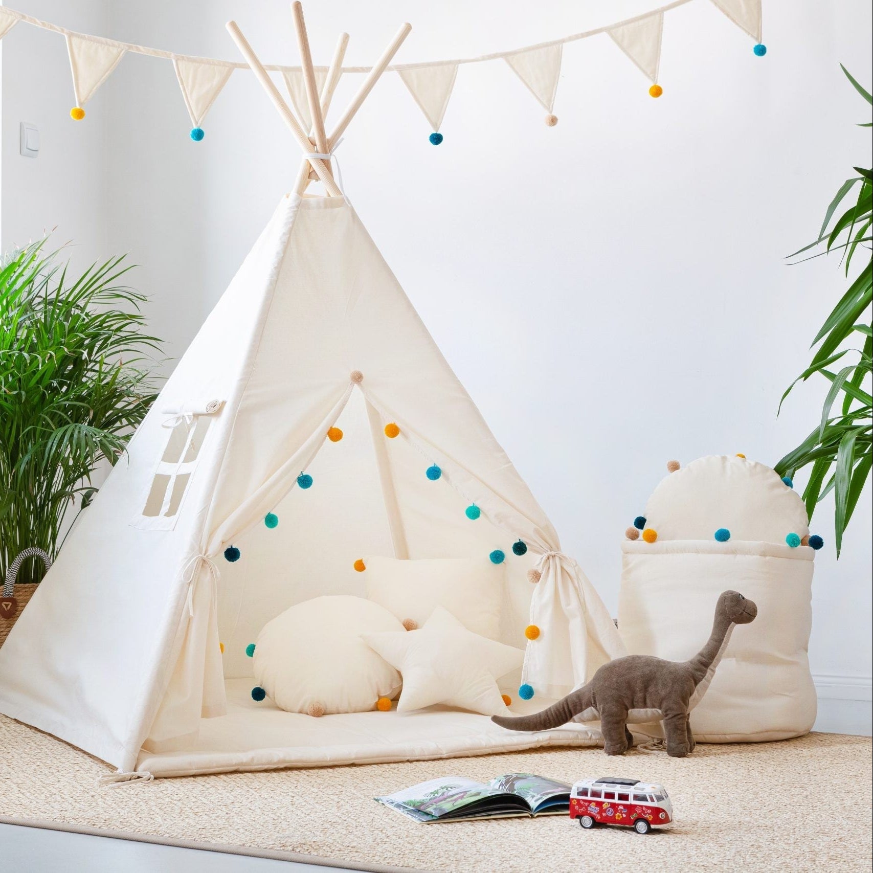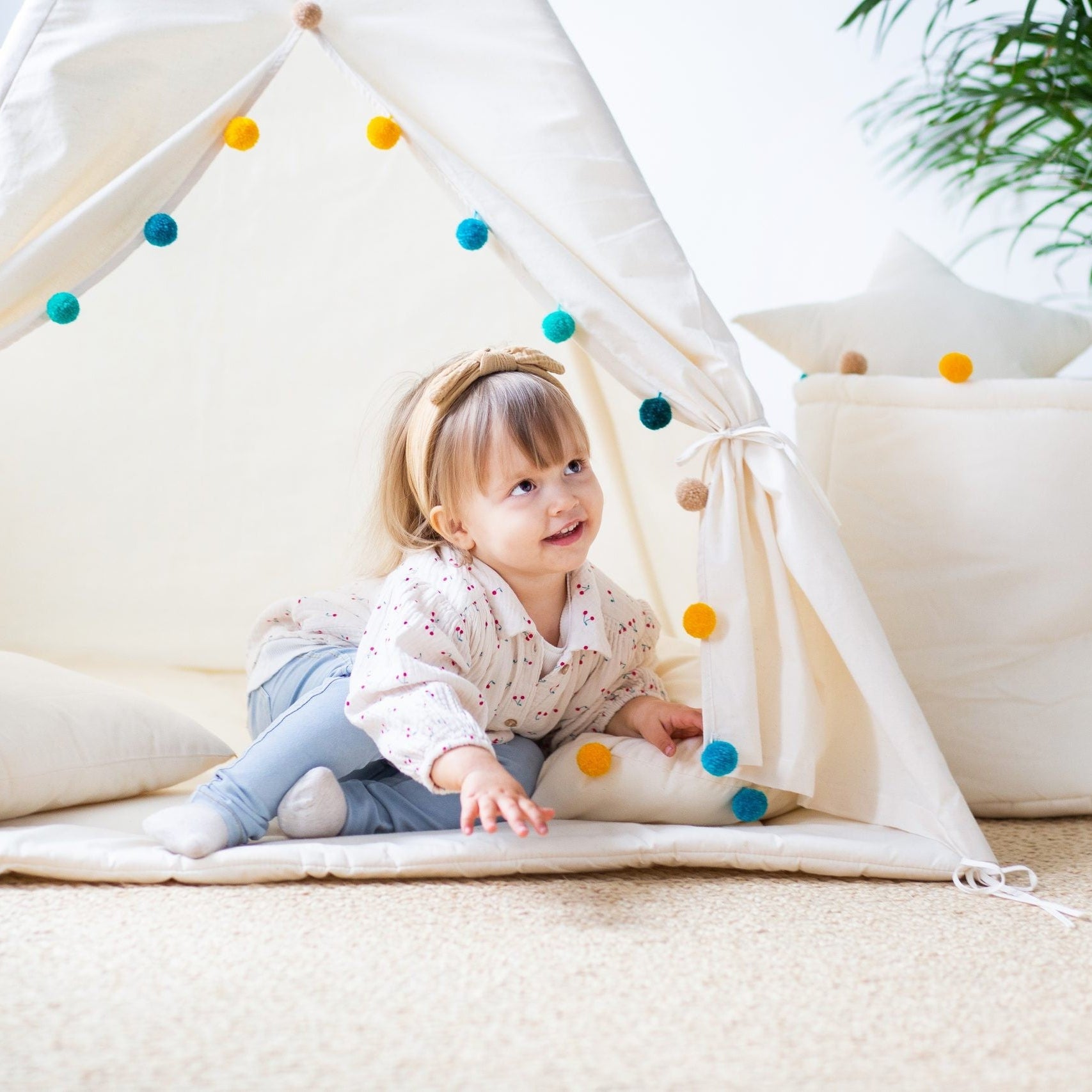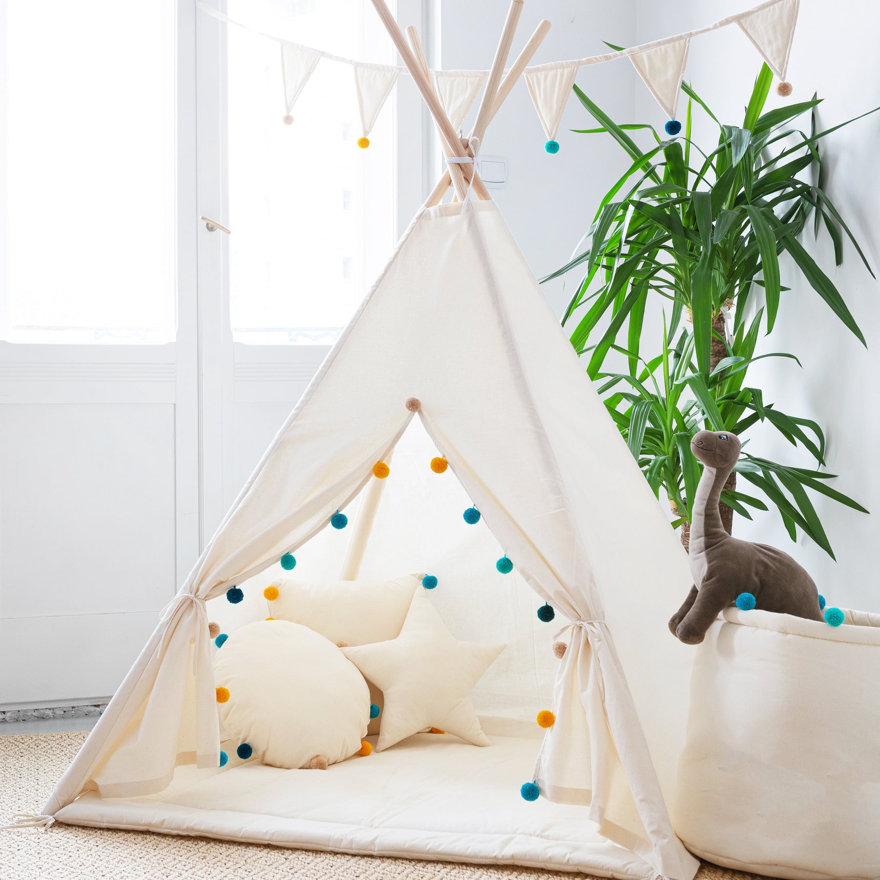 À l'intérieur : des murs crème enveloppent comme une couverture chaude, et la lumière entre par l'ouverture en jouant avec les pompons. À l'extérieur : une tente élégante en Whisper White, décorée de pompons faits main en fil duveteux et anti-boulochage – chacun différent, chacun unique, comme des cailloux trouvés au bord de la rivière.
