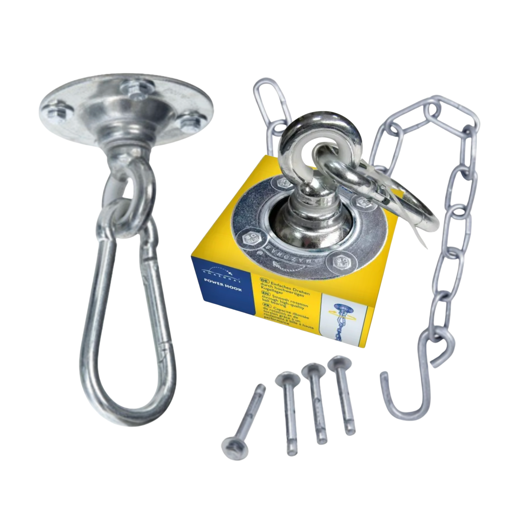 Powerhook Amazonas to profesjonalny zestaw montażowy do zawieszenia kokonu, hamaka lub huśtawki. Nie jest to zwykły hak sufitowy – to system zaprojektowany przez Niemców, który sprawia, że kokon wisi bezpiecznie i obraca się płynnie przez lata.